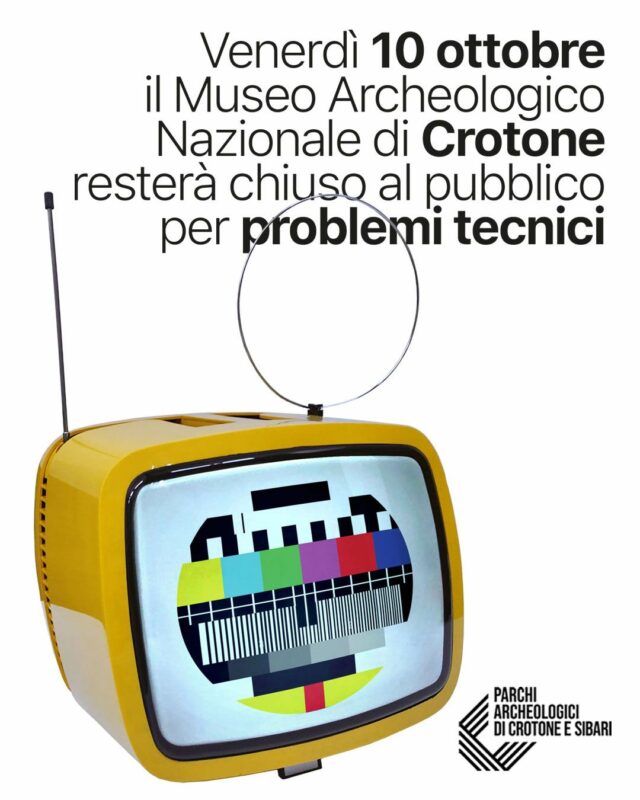 Eventi, NewsCHIUSURA 10 OTTOBRE MUSEO ARCHEOLOGICO NAZIONALE DI CROTONE 09 Ott Venerdì 10 ottobre 2025 il Museo Arcgheologico Nazionale di Crotone resterà chiuso al pubblico per problemi tecnici. Ci scusiamo per il disagio e vi ringraziamo per la comprensione.